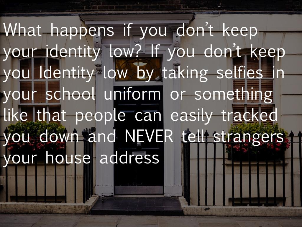 What happens if you don’t keep your identity low? If you don’t keep you Identity low by taking selfies in your school uniform or something like that people can easily tracked you down and NEVER tell strangers your house address