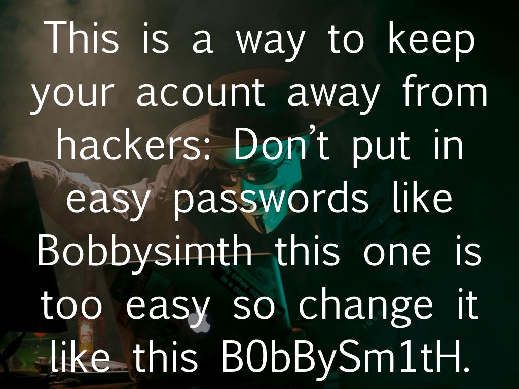 This is a way to keep your acount away from hackers: Don’t put in easy passwords like Bobbysimth this one is too easy so change it like this B0bBySm1tH.