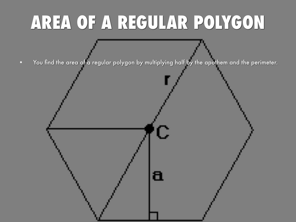You find the area of a regular polygon by multiplying half by the apothem and the perimeter.