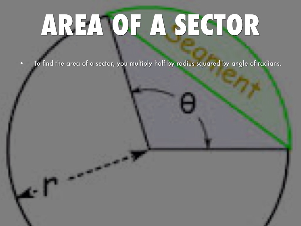 To find the area of a sector, you multiply half by radius squared by angle of radians.