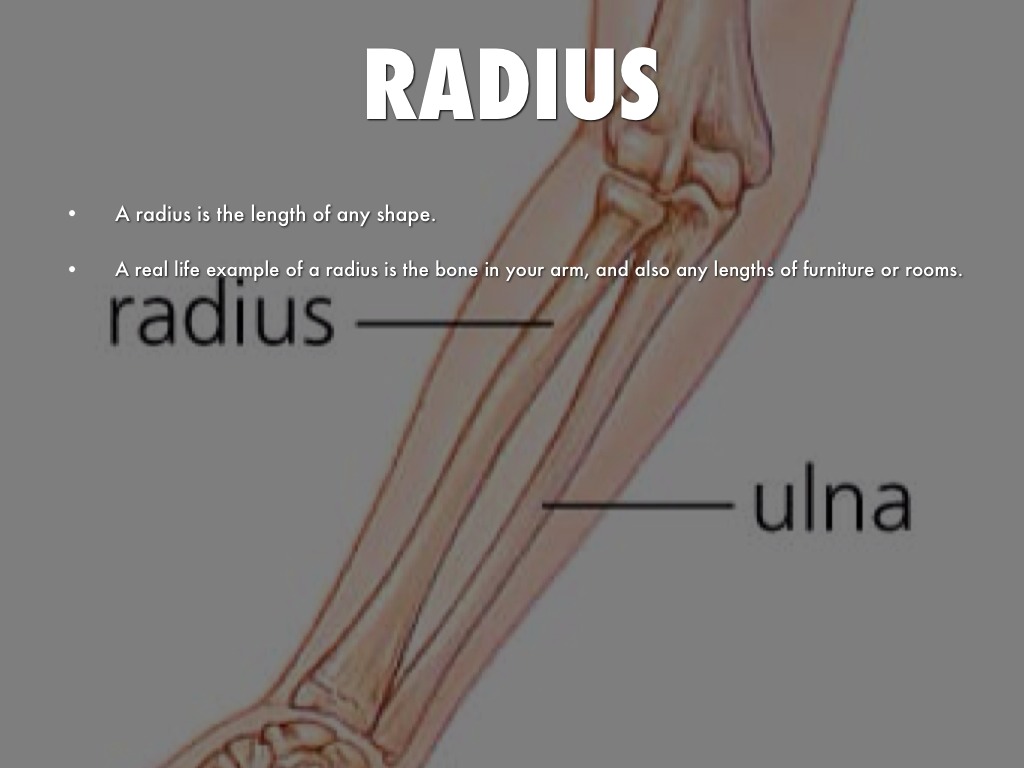 A real life example of a radius is the bone in your arm, and also any lengths of furniture or rooms.