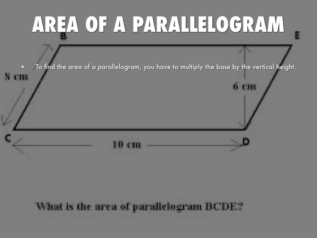 To find the area of a parallelogram, you have to multiply the base by the vertical height.
