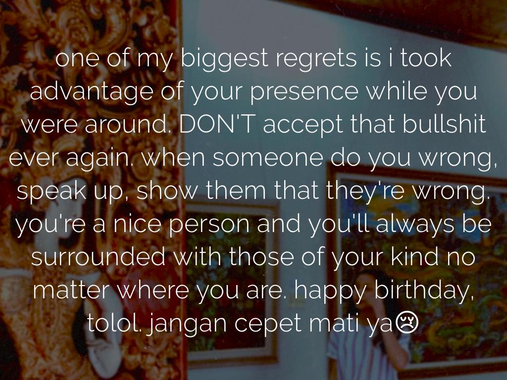 one of my biggest regrets is i took advantage of your presence while you were around. DON'T accept that bullshit ever again. when someone do you wrong, speak up, show them that they're wrong. you're a nice person and you'll always be surrounded with those of your kind no matter where you are. happy birthday, tolol. jangan cepet mati ya😢