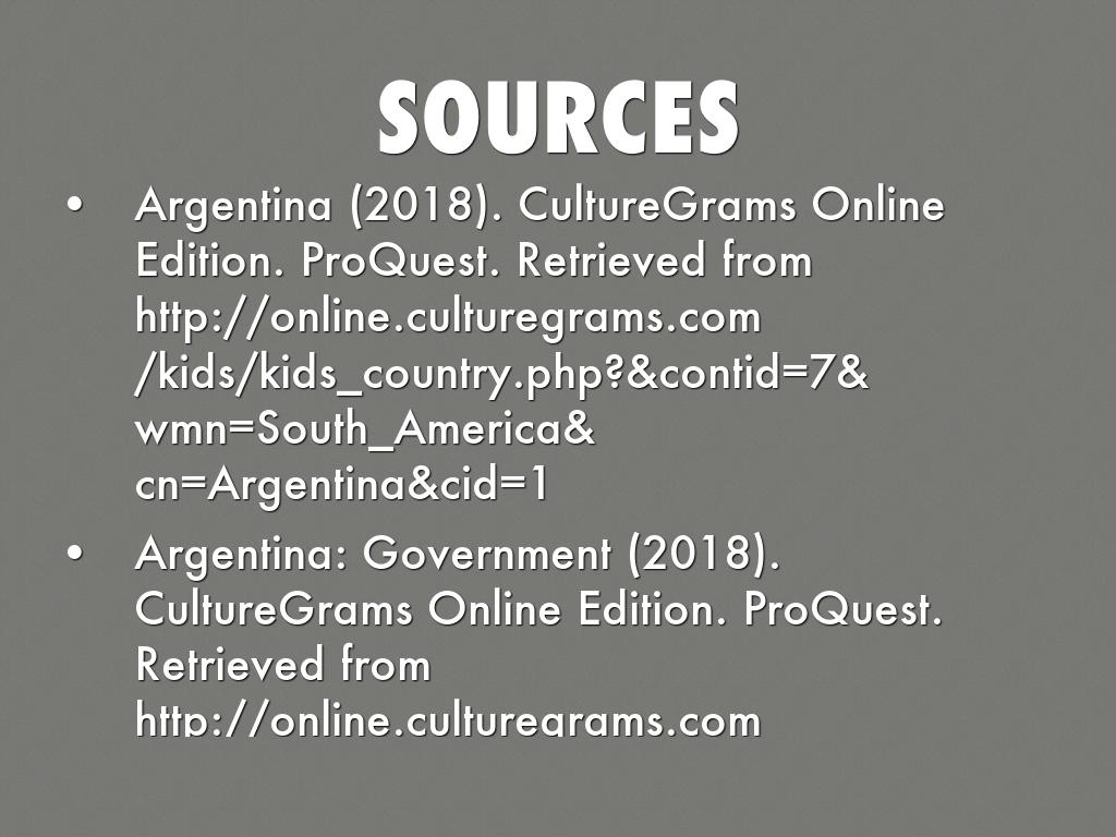 Argentina (2018). CultureGrams Online Edition. ProQuest. Retrieved from