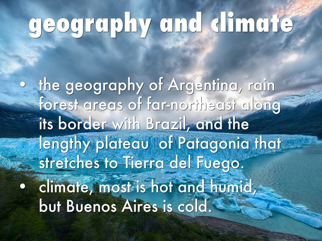 the geography of Argentina, rain forest areas of far-northeast along its border with Brazil, and the lengthy plateau of Patagonia that stretches to Tierra del Fuego.
