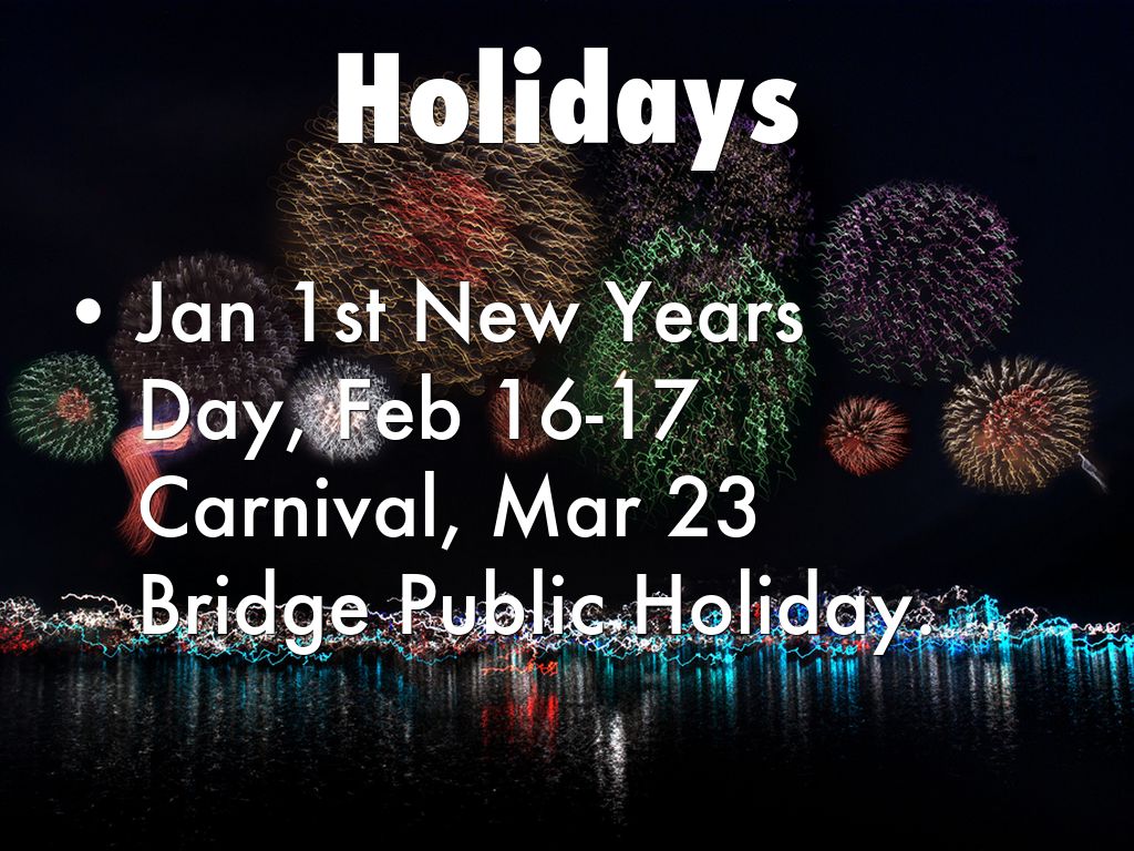 Jan 1st New Years Day, Feb 16-17 Carnival, Mar 23 Bridge Public Holiday.