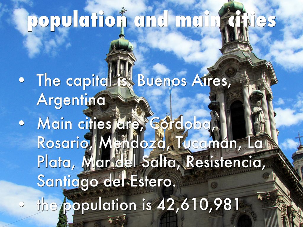 Main cities are, Córdoba, Rosario, Mendoza, Tucamán, La Plata, Mar del Salta, Resistencia, Santiago del Estero.