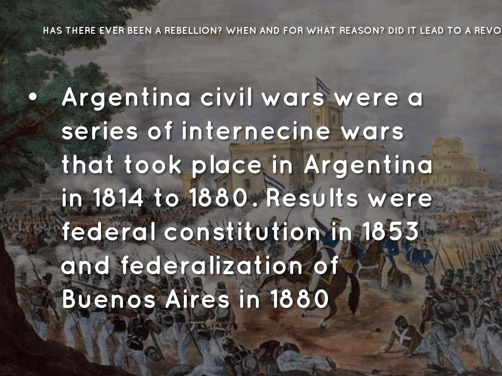 • Argentina civil wars were a series of internecine wars that took place in Argentina in 1814 to 1880. Results were federal constitution in 1853 and federalization of Buenos Aires in 1880