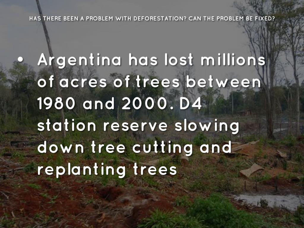 • Argentina has lost millions of acres of trees between 1980 and 2000. D4 station reserve slowing down tree cutting and replanting trees