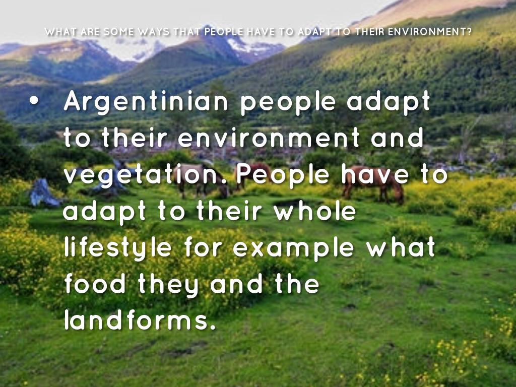 • Argentinian people adapt to their environment and vegetation. People have to adapt to their whole lifestyle for example what food they and the landforms.
