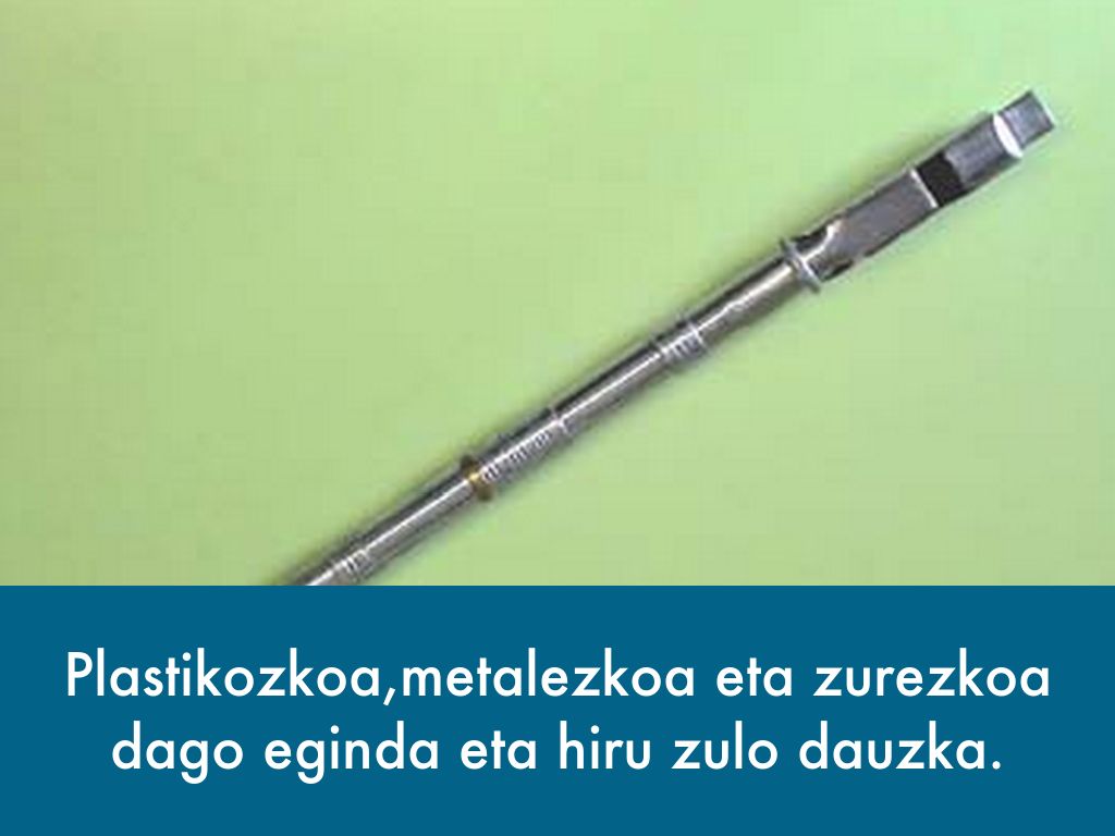 Plastikozkoa,metalezkoa eta zurezkoa dago eginda eta hiru zulo dauzka.