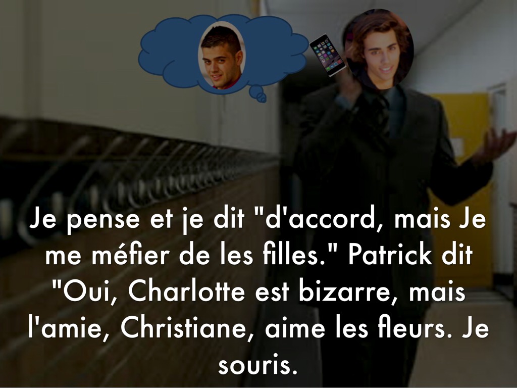 Je pense et je dit "d'accord, mais Je me méfier de les filles." Patrick dit "Oui, Charlotte est bizarre, mais l'amie, Christiane, aime les fleurs. Je souris.