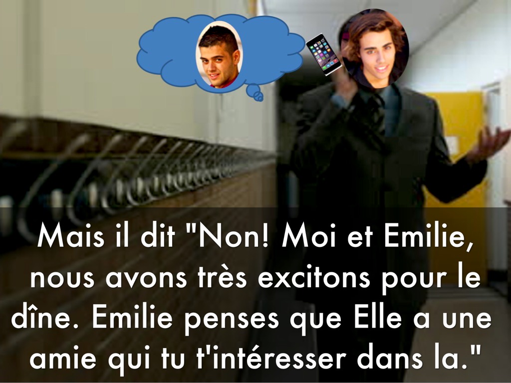 Mais il dit "Non! Moi et Emilie, nous avons très excitons pour le dîne. Emilie penses que Elle a une amie qui tu t'intéresser dans la."