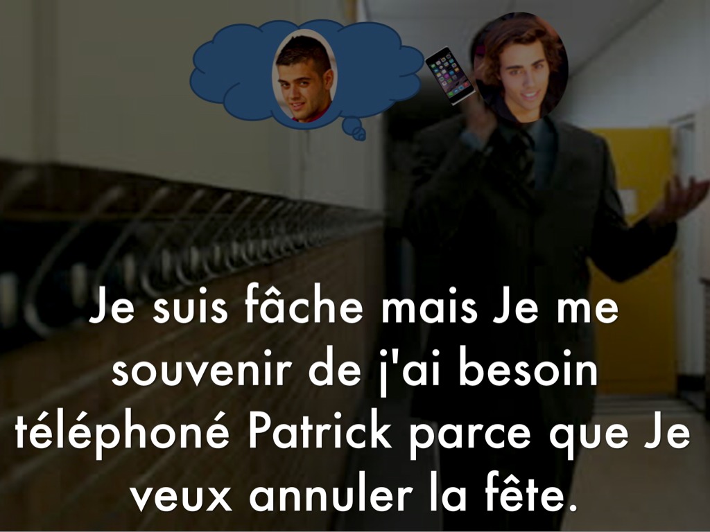 Je suis fâche mais Je me souvenir de j'ai besoin téléphoné Patrick parce que Je veux annuler la fête.