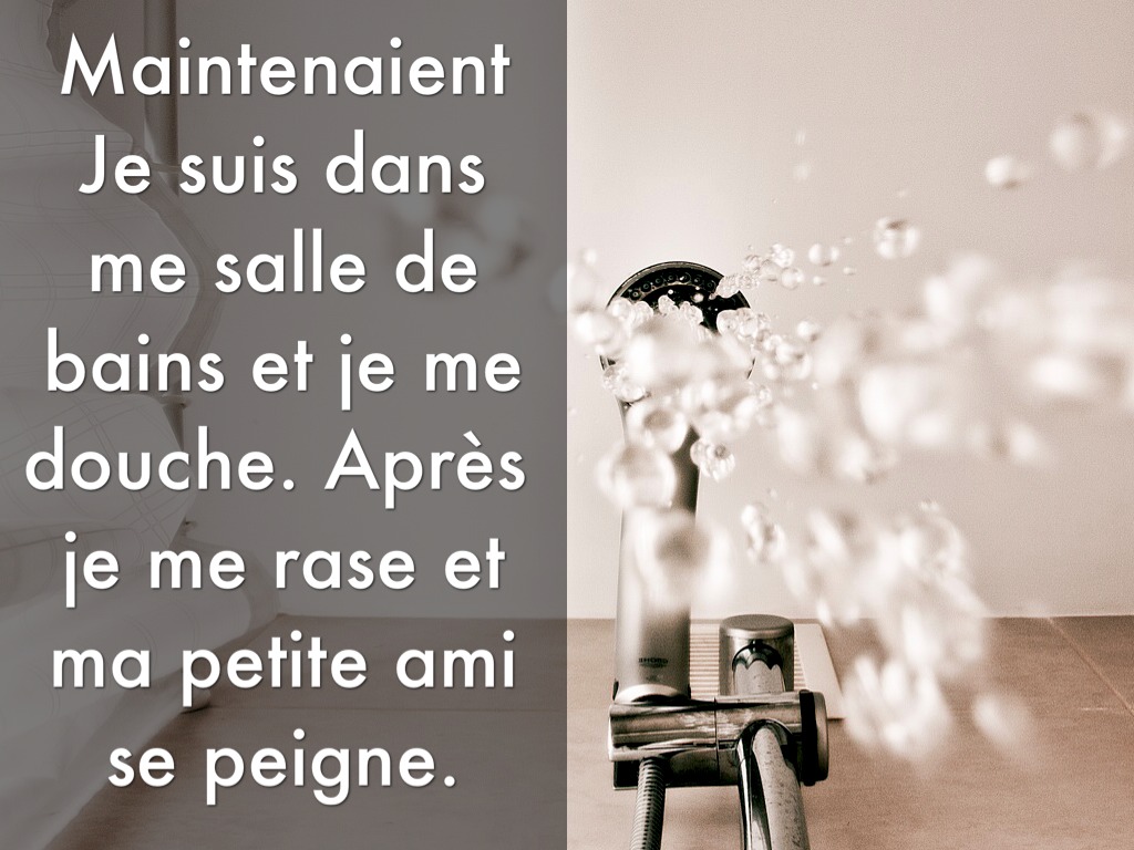 Maintenaient Je suis dans me salle de bains et je me douche. Après je me rase et ma petite ami se peigne.