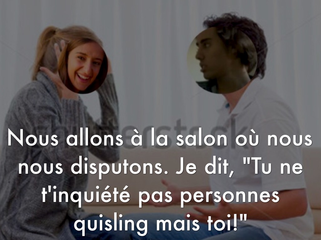 Nous allons à la salon où nous nous disputons. Je dit, "Tu ne t'inquiété pas personnes quisling mais toi!"