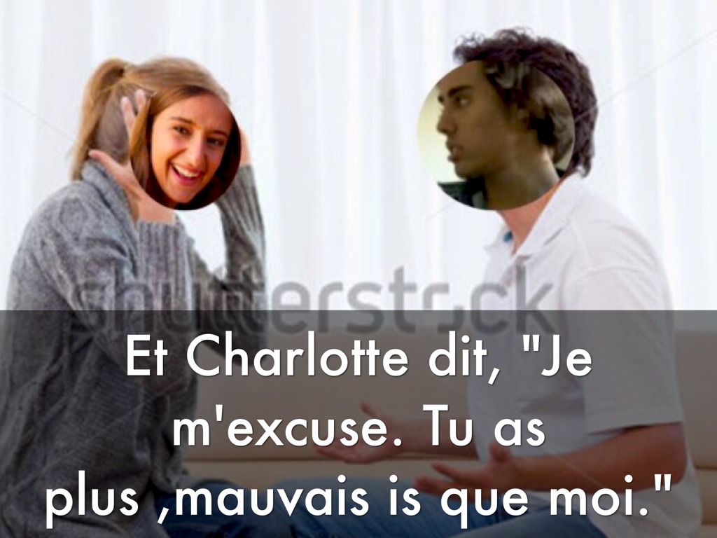 Et Charlotte dit, "Je m'excuse. Tu as plus ,mauvais is que moi."