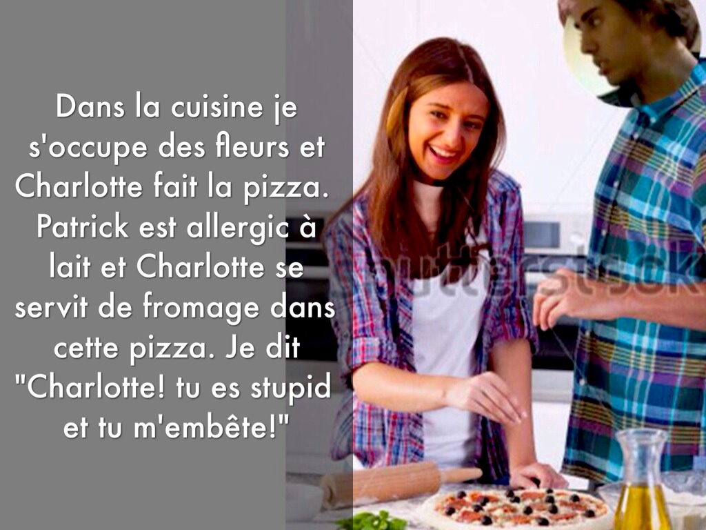 Dans la cuisine je s'occupe des fleurs et Charlotte fait la pizza. Patrick est allergic à lait et Charlotte se servit de fromage dans cette pizza. Je dit "Charlotte! tu es stupid et tu m'embête!"
