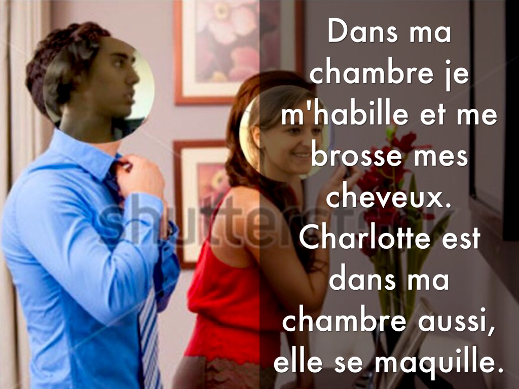 Dans ma chambre je m'habille et me brosse mes cheveux. Charlotte est dans ma chambre aussi, elle se maquille.