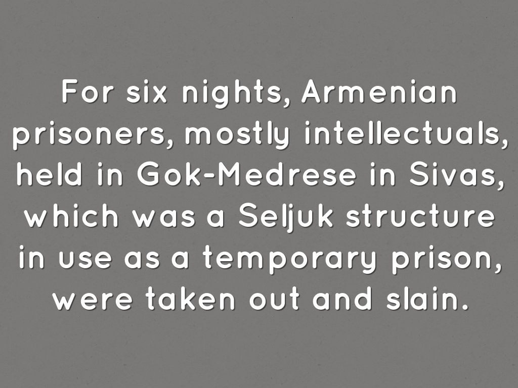 For six nights, Armenian prisoners, mostly intellectuals, held in Gok-Medrese in Sivas, which was a Seljuk structure in use as a temporary prison, were taken out and slain.