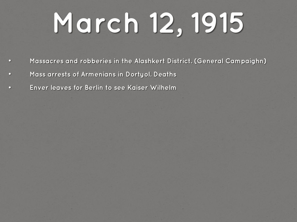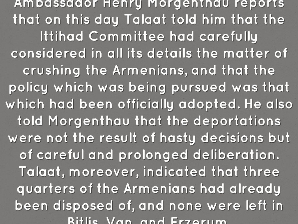Ambassador Henry Morgenthau reports that on this day Talaat told him that the Ittihad Committee had carefully considered in all its details the matter of crushing the Armenians, and that the policy which was being pursued was that which had been officially adopted. He also told Morgenthau that the deportations were not the result of hasty decisions but of careful and prolonged deliberation. Talaat, moreover, indicated that three quarters of the Armenians had already been disposed of, and none were left in Bitlis, Van, and Erzerum.