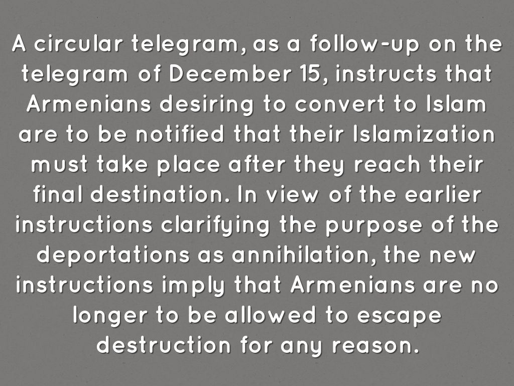 A circular telegram, as a follow-up on the telegram of December 15, instructs that Armenians desiring to convert to Islam are to be notified that their Islamization must take place after they reach their final destination. In view of the earlier instructions clarifying the purpose of the deportations as annihilation, the new instructions imply that Armenians are no longer to be allowed to escape destruction for any reason.