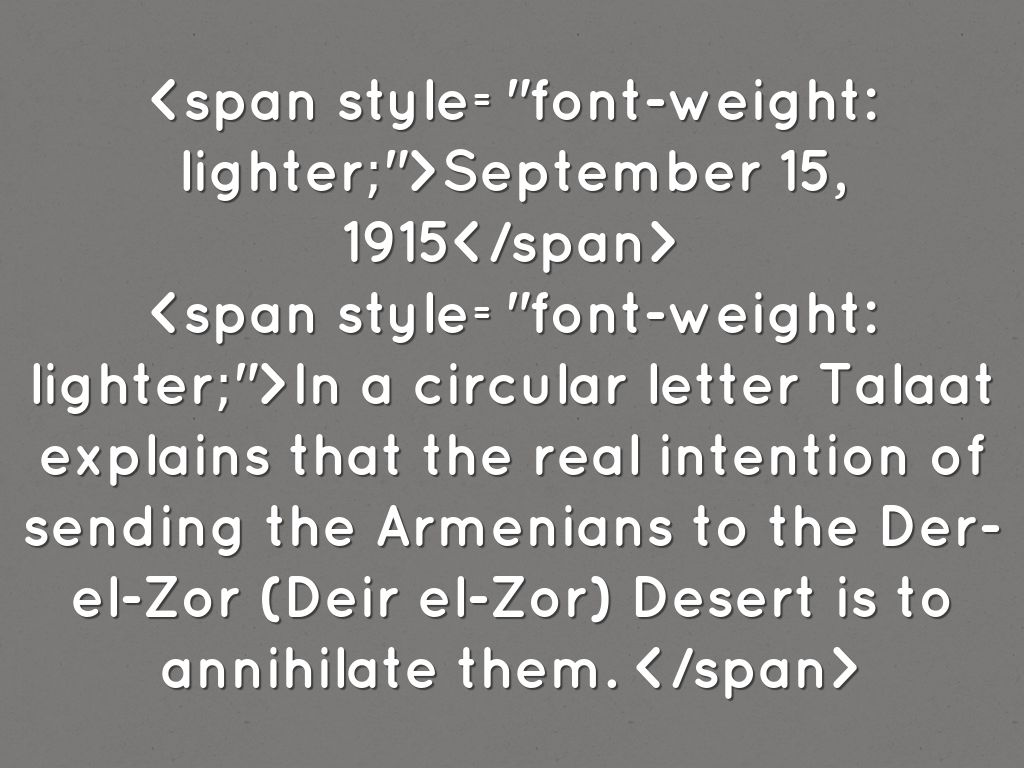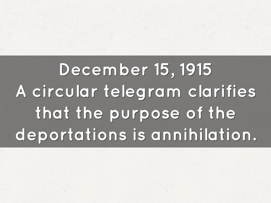 In a circular letter Talaat explains that the real intention of sending the Armenians to the Der-el-Zor (Deir el-Zor) Desert is to annihilate them.