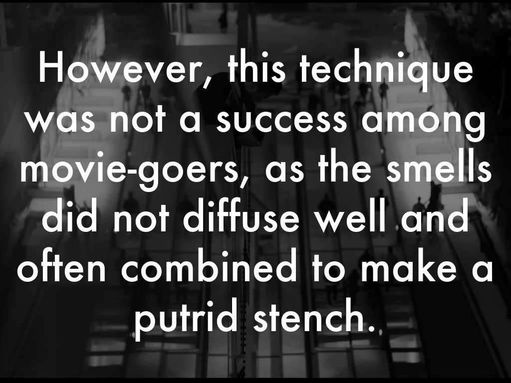 However, this technique was not a success among movie-goers, as the smells did not diffuse well and often combined to make a putrid stench.