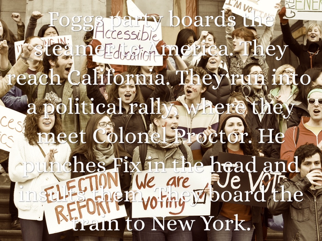 Foggs party boards the steamer to America. They reach California. They run into a political rally, where they meet Colonel Proctor. He punches Fix in the head and insults them. They board the train to New York.