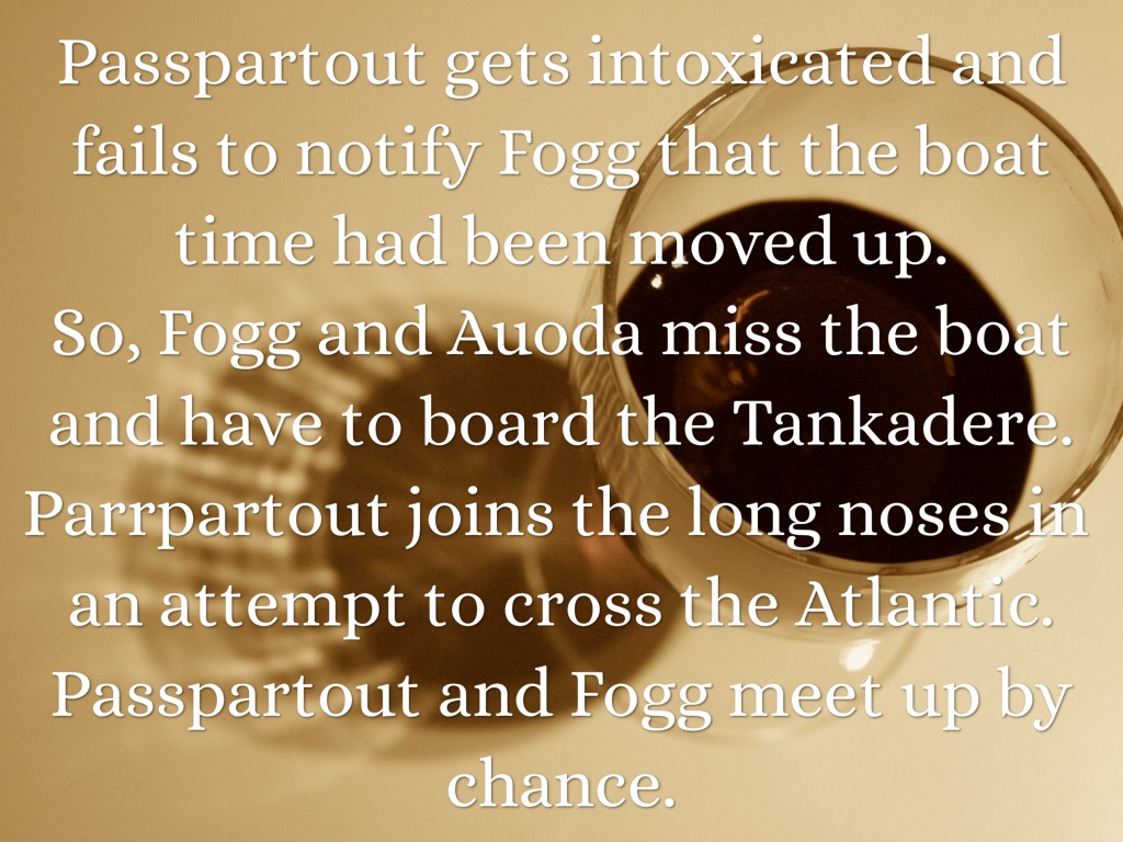 Passpartout gets intoxicated and fails to notify Fogg that the boat time had been moved up. So, Fogg and Auoda miss the boat and have to board the Tankadere. Parrpartout joins the long noses in an attempt to cross the Atlantic. Passpartout and Fogg meet up by chance.