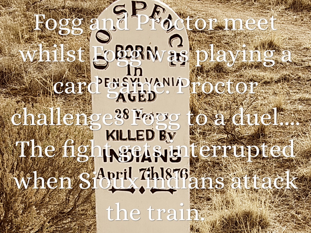 Fogg and Proctor meet whilst Fogg was playing a card game. Proctor challenges Fogg to a duel.... The fight gets interrupted when Sioux indians attack the train.