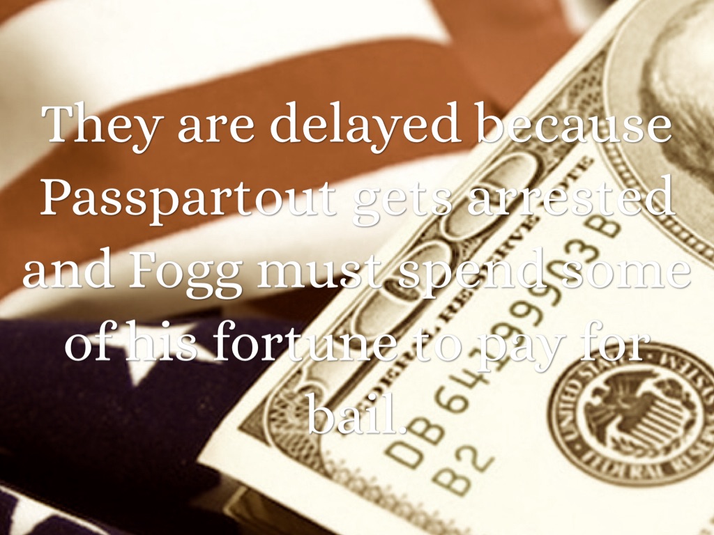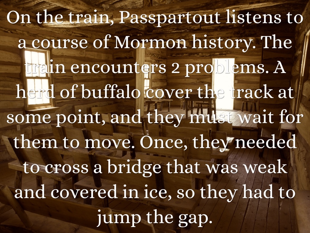 On the train, Passpartout listens to a course of Mormon history. The train encounters 2 problems. A herd of buffalo cover the track at some point, and they must wait for them to move. Once, they needed to cross a bridge that was weak and covered in ice, so they had to jump the gap.