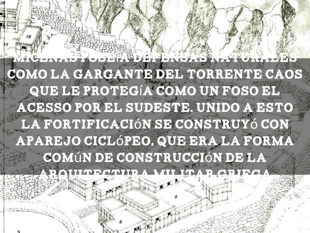 Micenas poseía defensas naturales como la gargante del torrente Caos que le protegía como un foso el acesso por el sudeste. Unido a esto la fortificación se construyó con aparejo ciclópeo, que era la forma común de construcción de la arquitectura militar griega