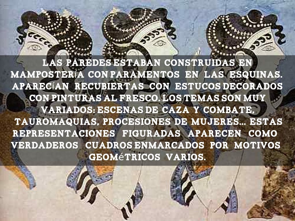 Las paredes estaban construidas en mampostería con paramentos en las esquinas. Aparecían recubiertas con estucos decorados con pinturas al fresco. Los temas son muy variados: escenas de caza y combate, tauromaquias, procesiones de mujeres... estas representaciones figuradas aparecen como verdaderos cuadros enmarcados por motivos geométricos varios.