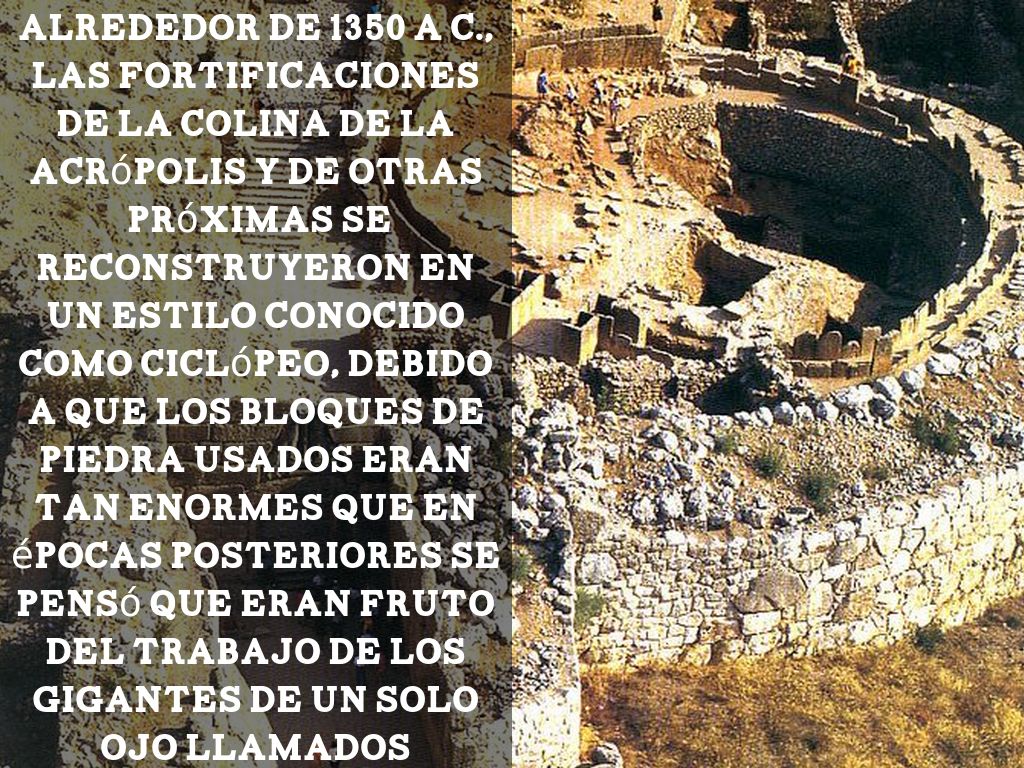 Alrededor de 1350 a C., las fortificaciones de la colina de la acrópolis y de otras próximas se reconstruyeron en un estilo conocido como ciclópeo, debido a que los bloques de piedra usados eran tan enormes que en épocas posteriores se pensó que eran fruto del trabajo de los gigantes de un solo ojo llamados