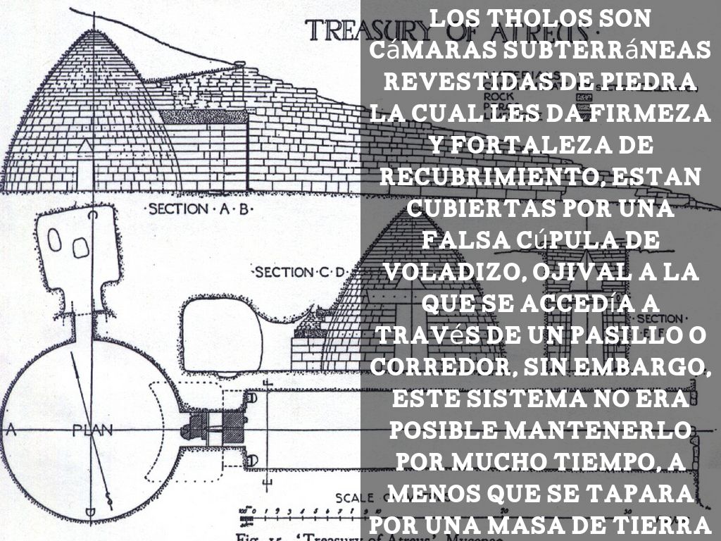 Los tholos son cámaras subterráneas revestidas de piedra la cual les da firmeza y fortaleza de recubrimiento, estan cubiertas por una falsa cúpula de voladizo, ojival a la que se accedía a través de un pasillo o corredor, sin embargo, este sistema no era posible mantenerlo por mucho tiempo, a menos que se tapara por una masa de tierra con la finalidad de hacer peso y que impidiese su desplazamiento.