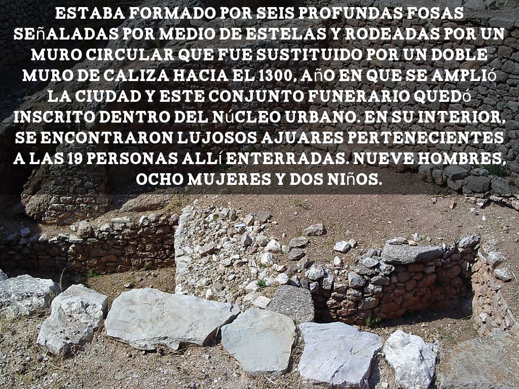 estaba formado por seis profundas fosas señaladas por medio de estelas y rodeadas por un muro circular que fue sustituido por un doble muro de caliza hacia el 1300, año en que se amplió la ciudad y este conjunto funerario quedó inscrito dentro del núcleo urbano. En su interior, se encontraron lujosos ajuares pertenecientes a las 19 personas allí enterradas. nueve hombres, ocho mujeres y dos niños.