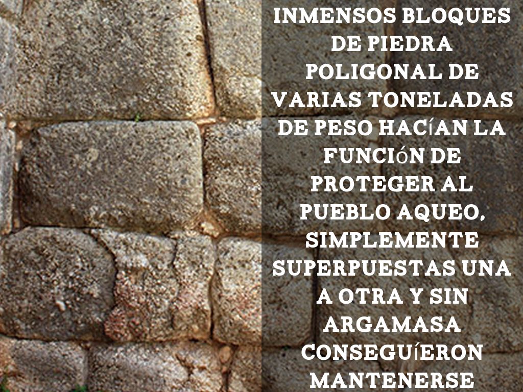 Inmensos bloques de piedra poligonal de varias toneladas de peso hacían la función de proteger al pueblo aqueo, simplemente superpuestas una a otra y sin argamasa conseguíeron mantenerse largo tiempo gracias a la habilidad de sus arquitectos.