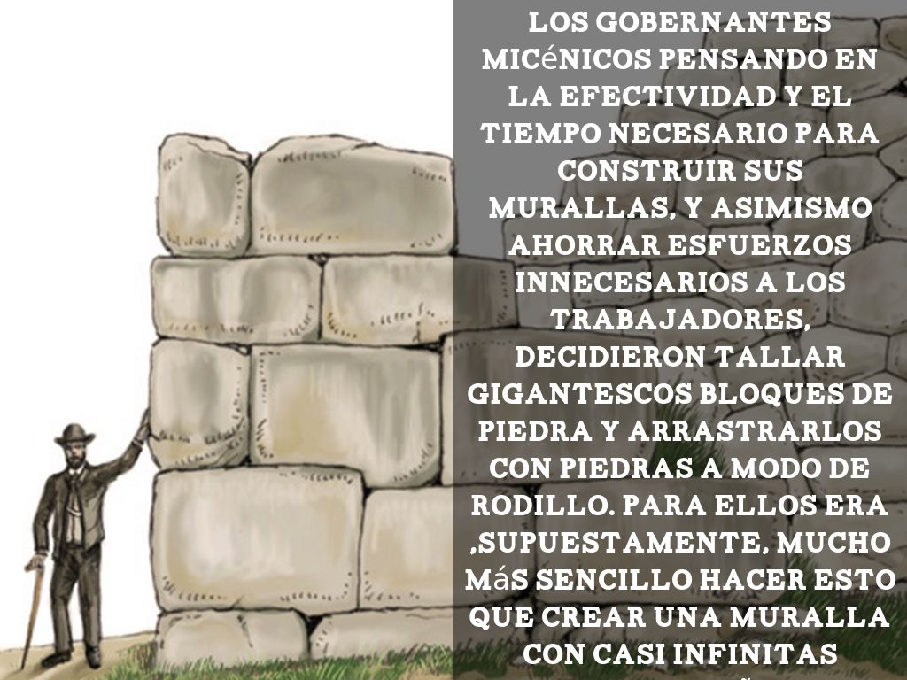 Los gobernantes micénicos pensando en la efectividad y el tiempo necesario para construir sus murallas, y asimismo ahorrar esfuerzos innecesarios a los trabajadores, decidieron tallar gigantescos bloques de piedra y arrastrarlos con piedras a modo de rodillo. Para ellos era ,supuestamente, mucho más sencillo hacer esto que crear una muralla con casi infinitas piedras pequeñas que requerían mucho más trabajo.