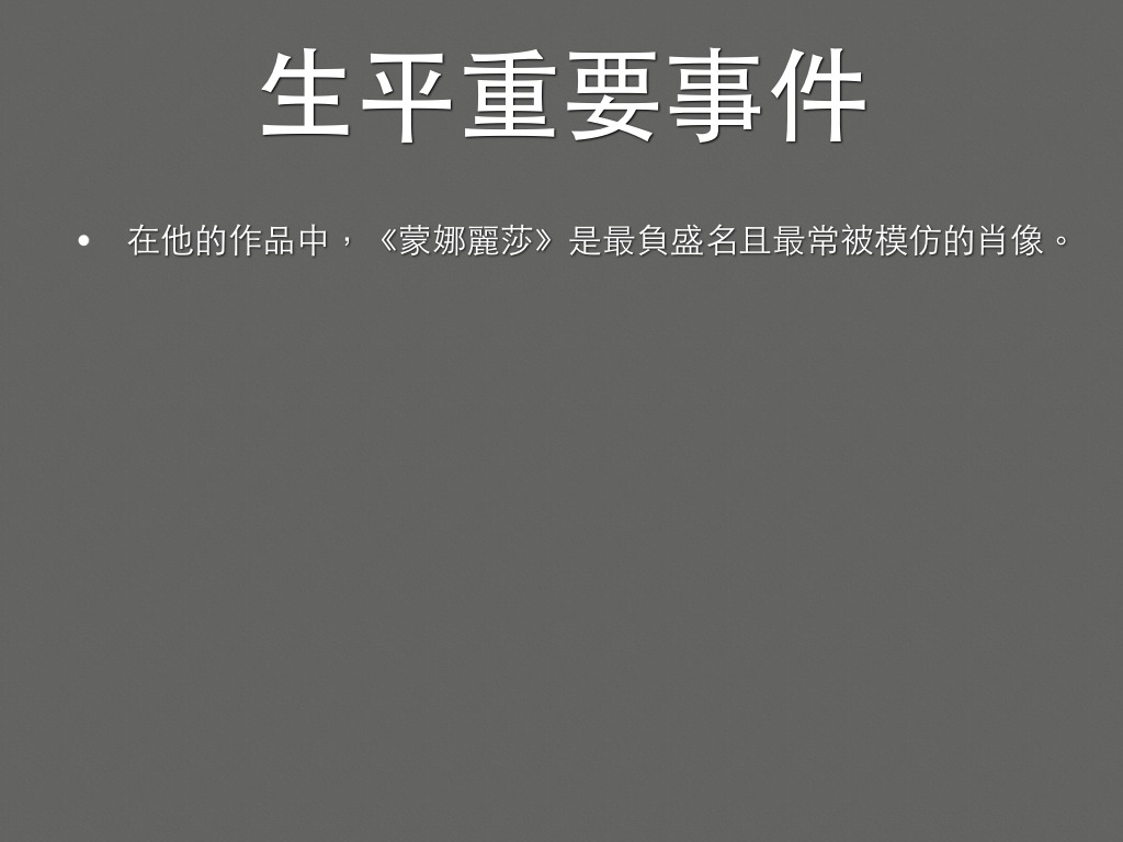 在他的作品中,《蒙娜麗莎》是最負盛名且最常被模仿的肖像。