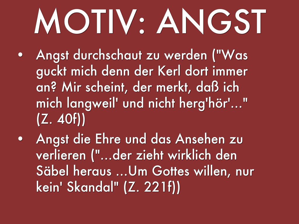 - Angst die Ehre und das Ansehen zu verlieren ("...der zieht wirklich den Säbel heraus ...Um Gottes willen, nur kein' Skandal" (Z. 221f))