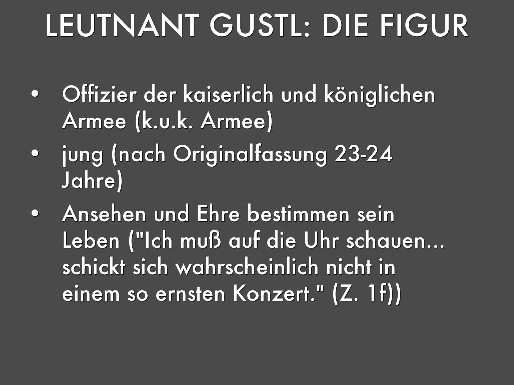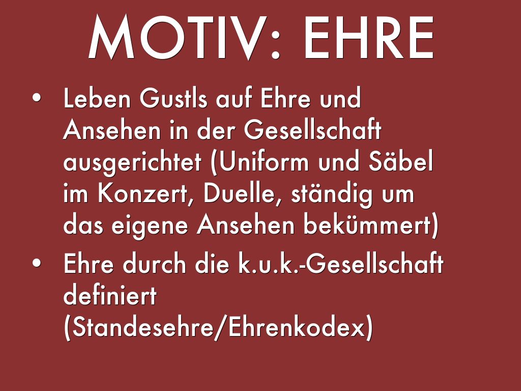 - Leben Gustls auf Ehre und Ansehen in der Gesellschaft ausgerichtet (Uniform und Säbel im Konzert, Duelle, ständig um das eigene Ansehen bekümmert)