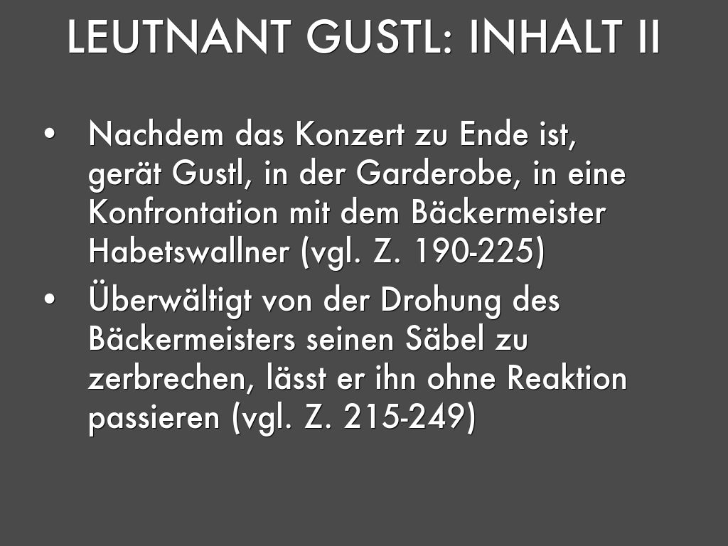 - Nachdem das Konzert zu Ende ist, gerät Gustl, in der Garderobe, in eine Konfrontation mit dem Bäckermeister Habetswallner (vgl. Z. 190-225)