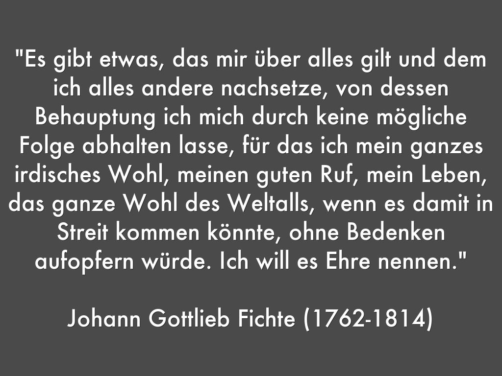 "Es gibt etwas, das mir über alles gilt und dem ich alles andere nachsetze, von dessen Behauptung ich mich durch keine mögliche Folge abhalten lasse, für das ich mein ganzes irdisches Wohl, meinen guten Ruf, mein Leben, das ganze Wohl des Weltalls, wenn es damit in Streit kommen könnte, ohne Bedenken aufopfern würde. Ich will es Ehre nennen."