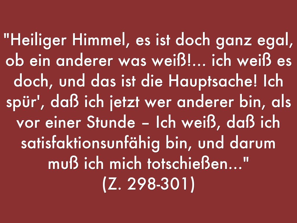 "Heiliger Himmel, es ist doch ganz egal, ob ein anderer was weiß!... ich weiß es doch, und das ist die Hauptsache! Ich spür', daß ich jetzt wer anderer bin, als vor einer Stunde – Ich weiß, daß ich satisfaktionsunfähig bin, und darum muß ich mich totschießen..."