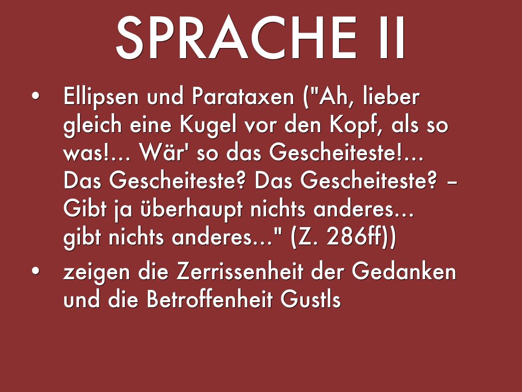 - Ellipsen und Parataxen ("Ah, lieber gleich eine Kugel vor den Kopf, als so was!... Wär' so das Gescheiteste!... Das Gescheiteste? Das Gescheiteste? – Gibt ja überhaupt nichts anderes... gibt nichts anderes..." (Z. 286ff))