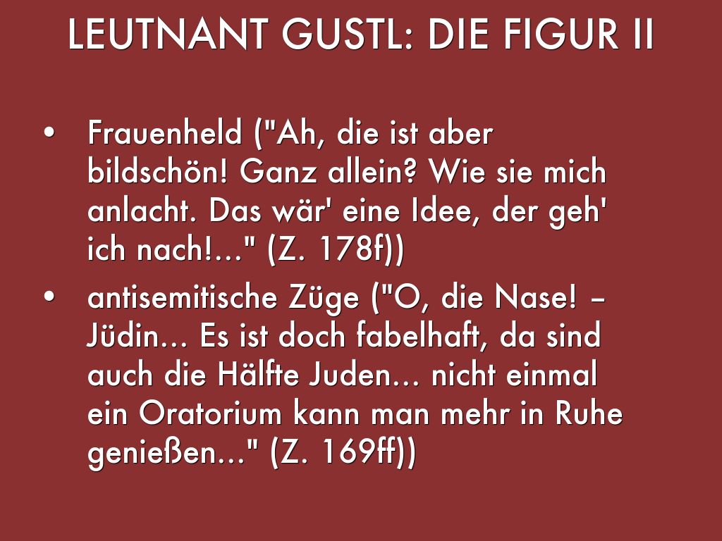 - antisemitische Züge ("O, die Nase! – Jüdin... Es ist doch fabelhaft, da sind auch die Hälfte Juden... nicht einmal ein Oratorium kann man mehr in Ruhe genießen..." (Z. 169ff))
