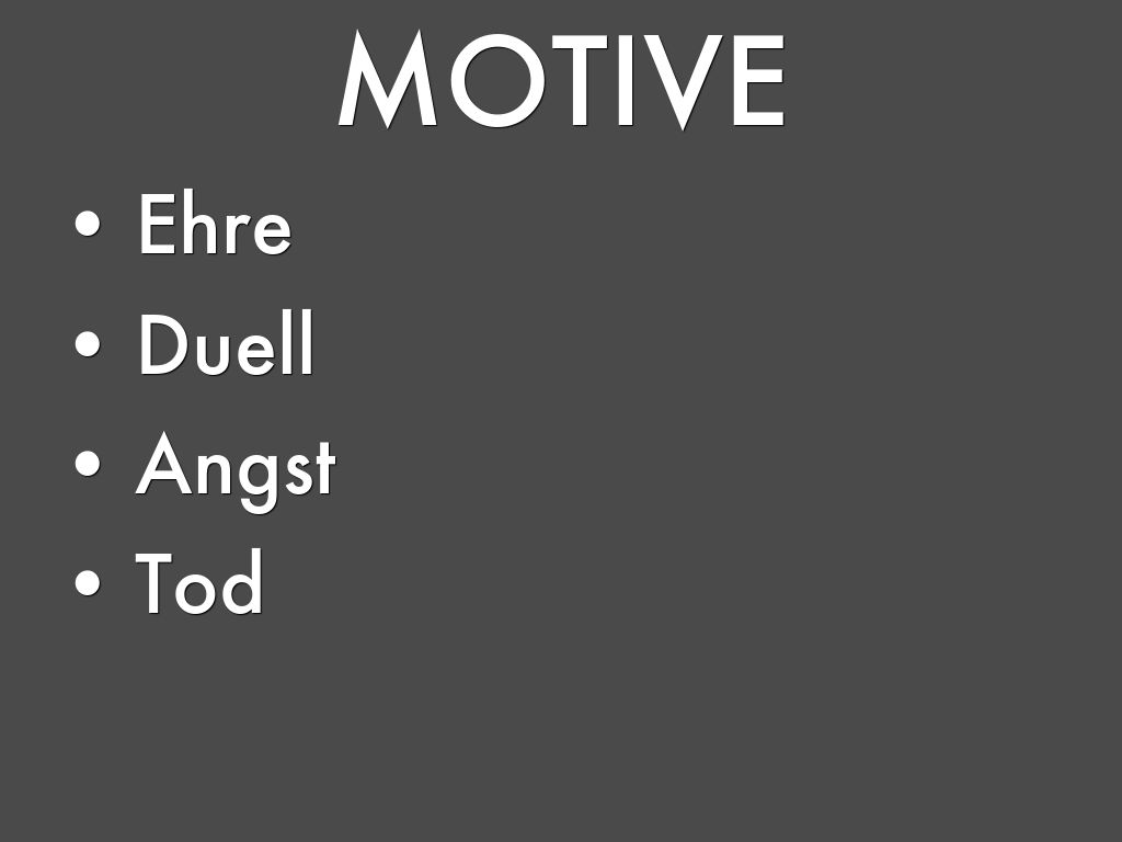 - Tod durch Duell ("...übermorgen bin ich vielleicht schon eine tote Leiche!" (Z. 25f))