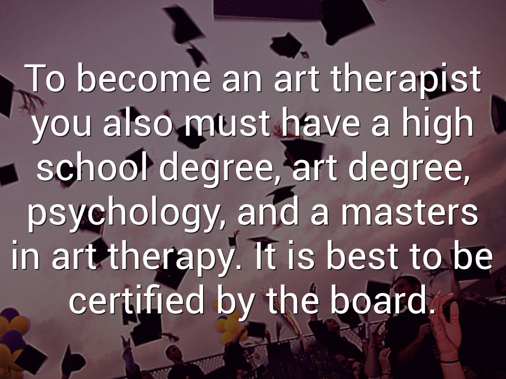 To become an art therapist you also must have a high school degree, art degree, psychology, and a masters in art therapy. It is best to be certified by the board.