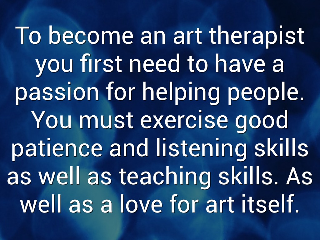 To become an art therapist you first need to have a passion for helping people. You must exercise good patience and listening skills as well as teaching skills. As well as a love for art itself.